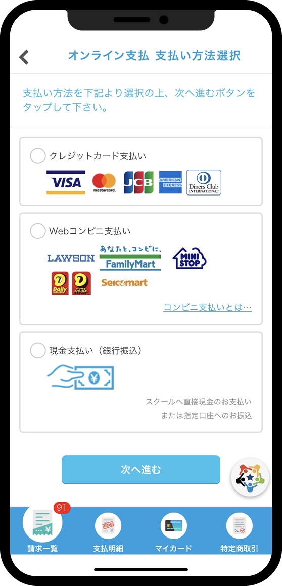 料金はSgrumアプリからオンライン決済でお支払いできます。クレジットカード決済、Webコンビニ決済をご利用いただけます。